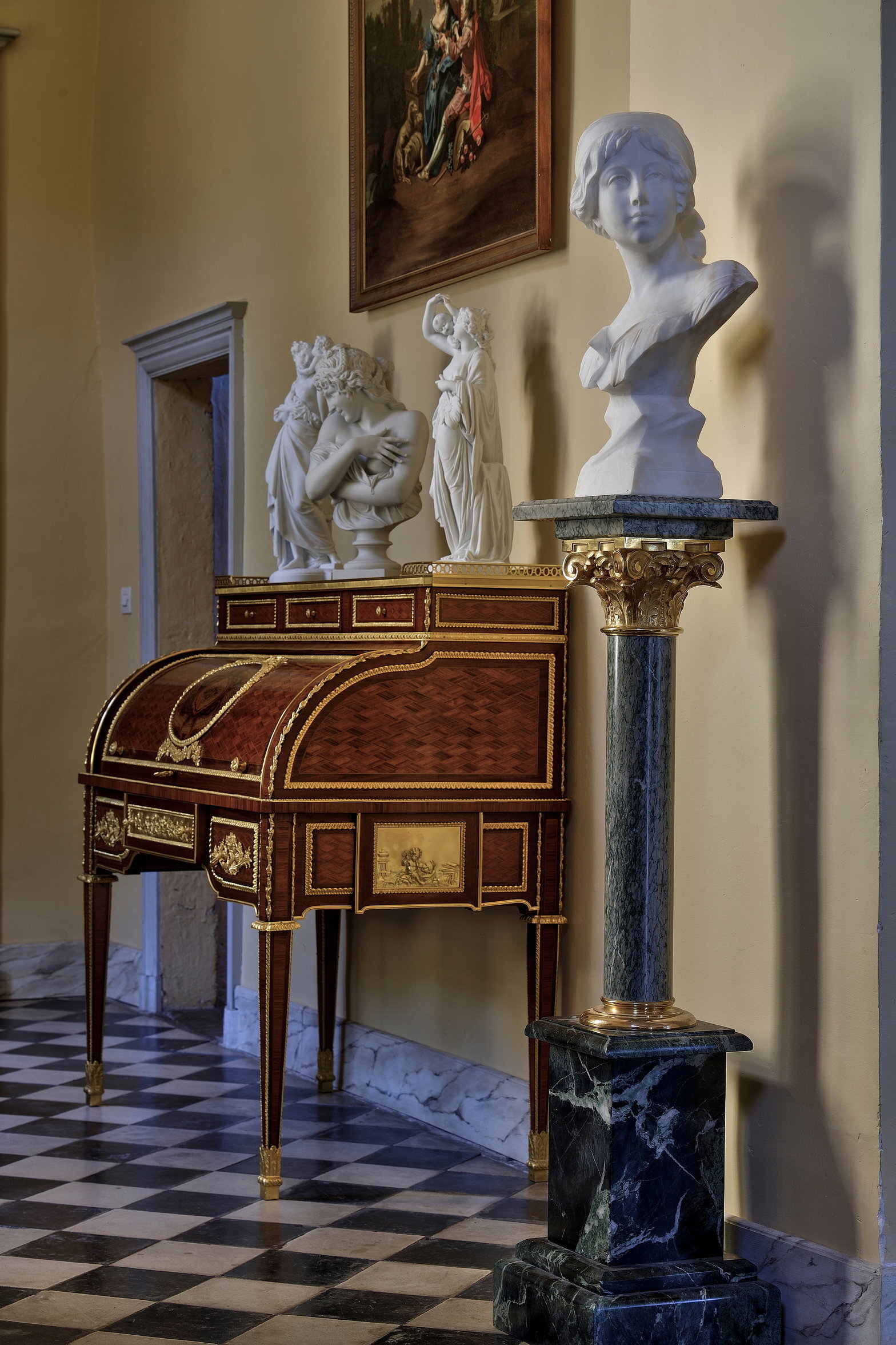 L'Entrée du Château de Peyraud est décoré d'un magnifique bureau à cylindre d'après un modèle de Riesner, orné de plusieurs sculptures en porcelaine, dont une paire de biscuits. Au mur d'un tableau présentant une scène galante vient réchauffer l'espace. Et, au premier plan, on retrouve un buste en albâtre signé Cyprien reposant sur une colonne en marbre vert...