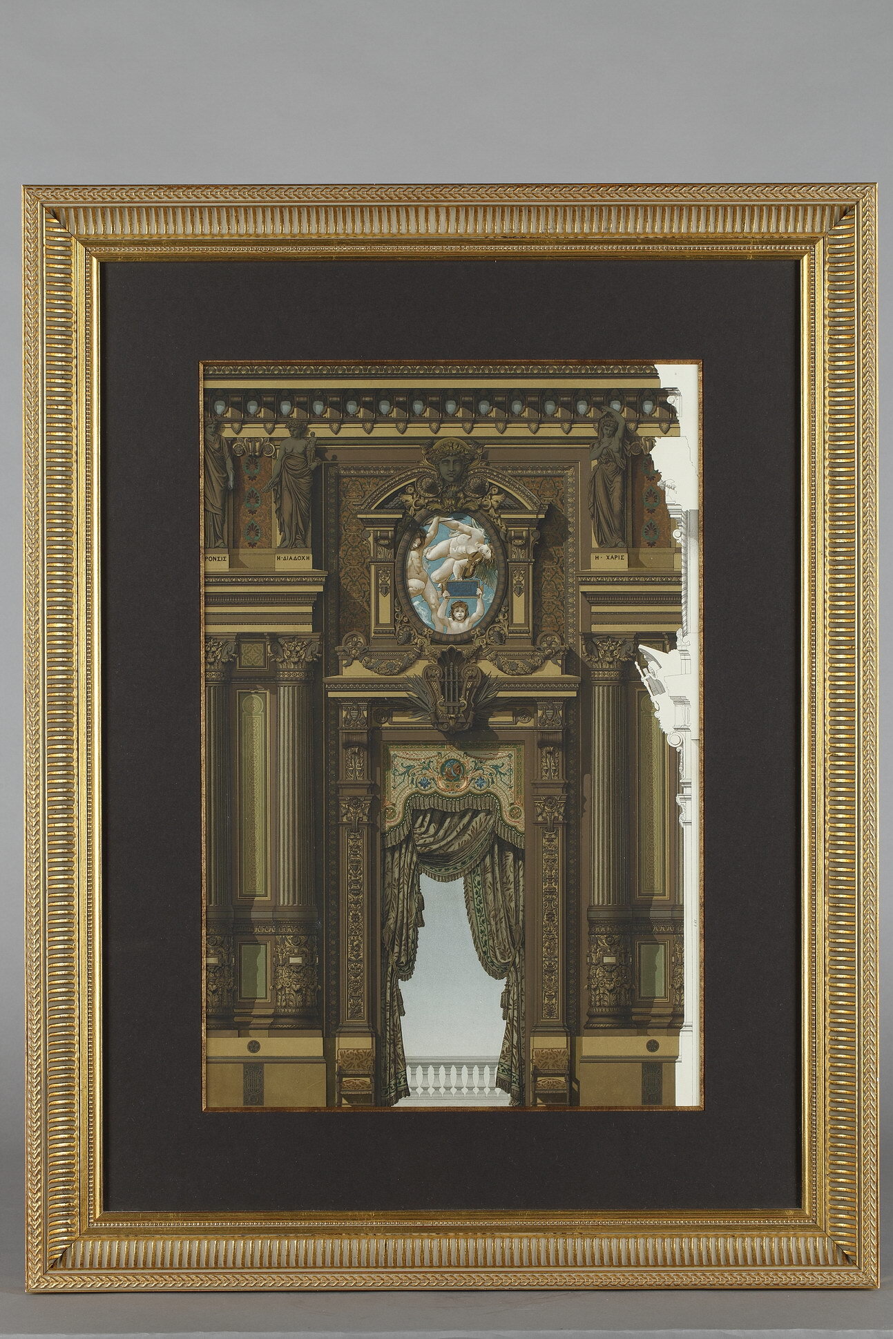 - La frise panoramique à l’Antique en papier peint représentant un cortège antique avec divinités mythologiques, Muses, Grâces...