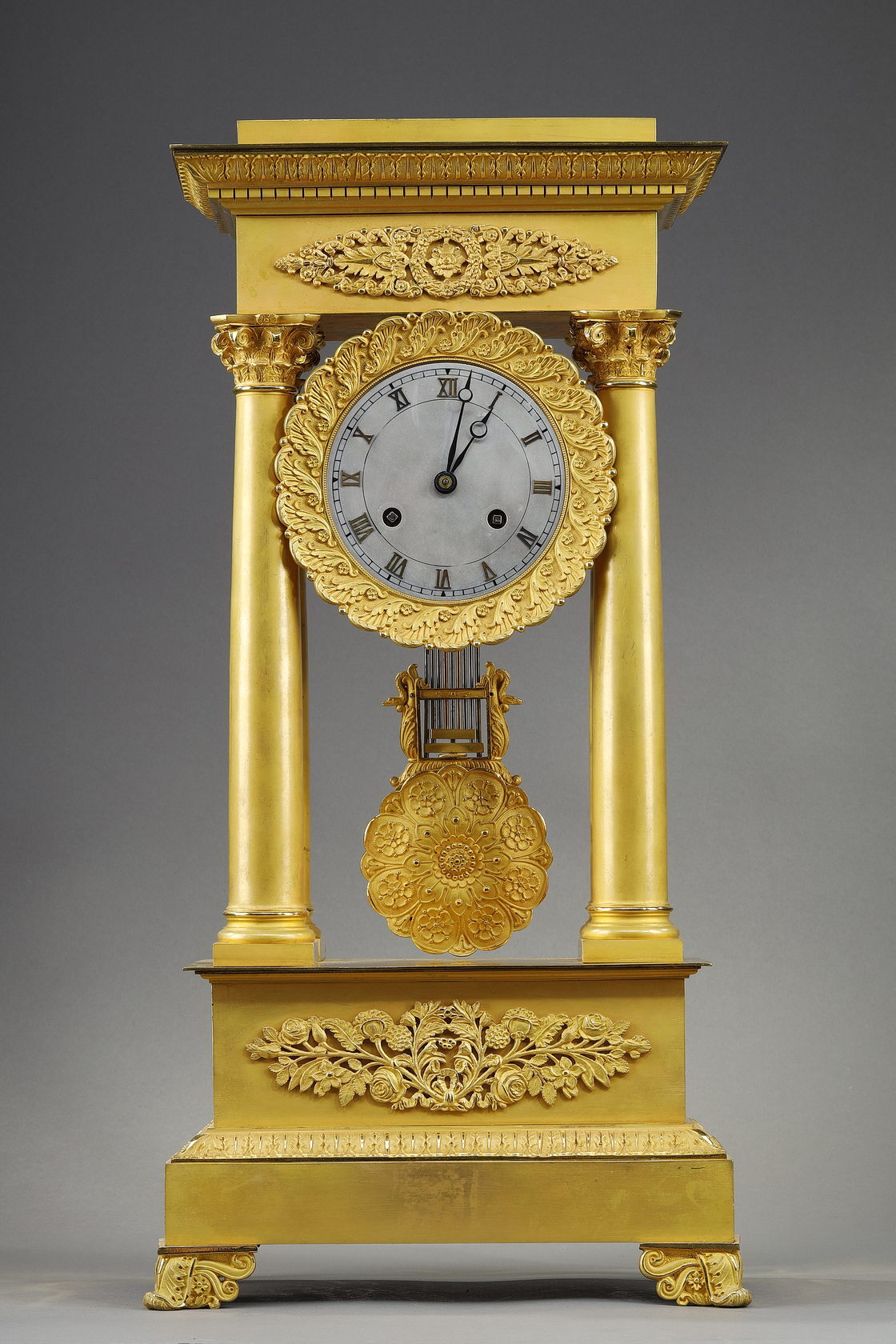 - La pendule à portique Restauration : une pièce rare, avec son mécanisme visible et ses colonnes corinthiennes.