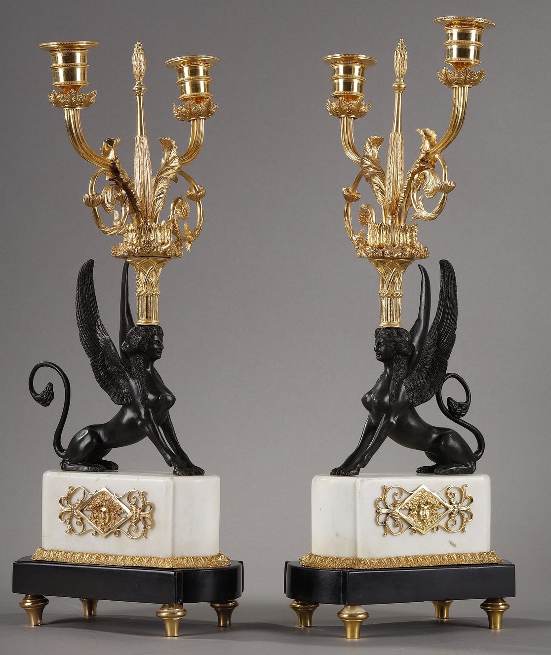 - Les candélabres aux sphinges : des créatures hybrides (lion à tête de femme) qui évoquent les mystères de l’Égypte antique.