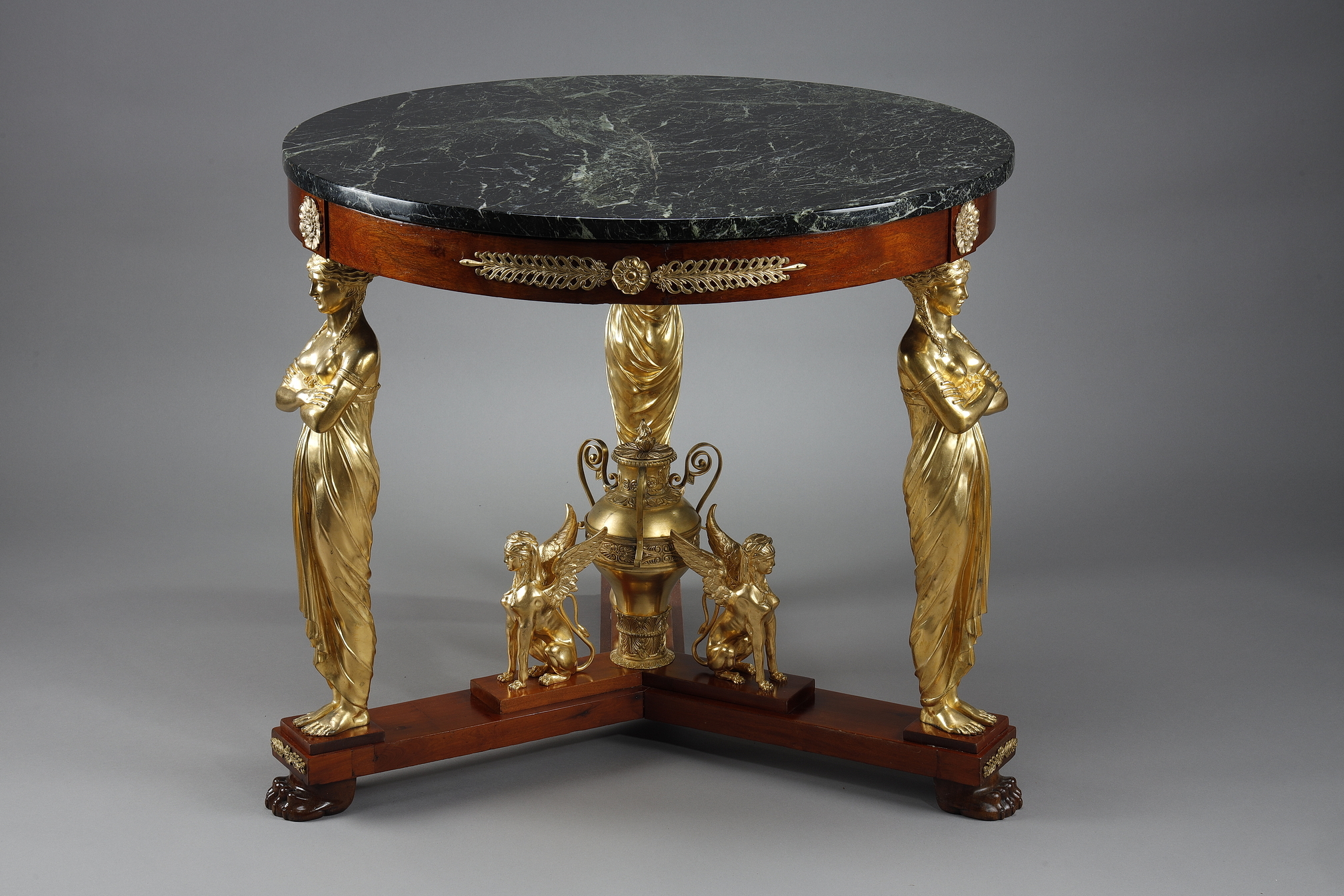 - Le guéridon Empire : Pièce centrale en acajou massif, avec un plateau en marbre griotte. Parfait pour exposer un vase ou une sculpture.