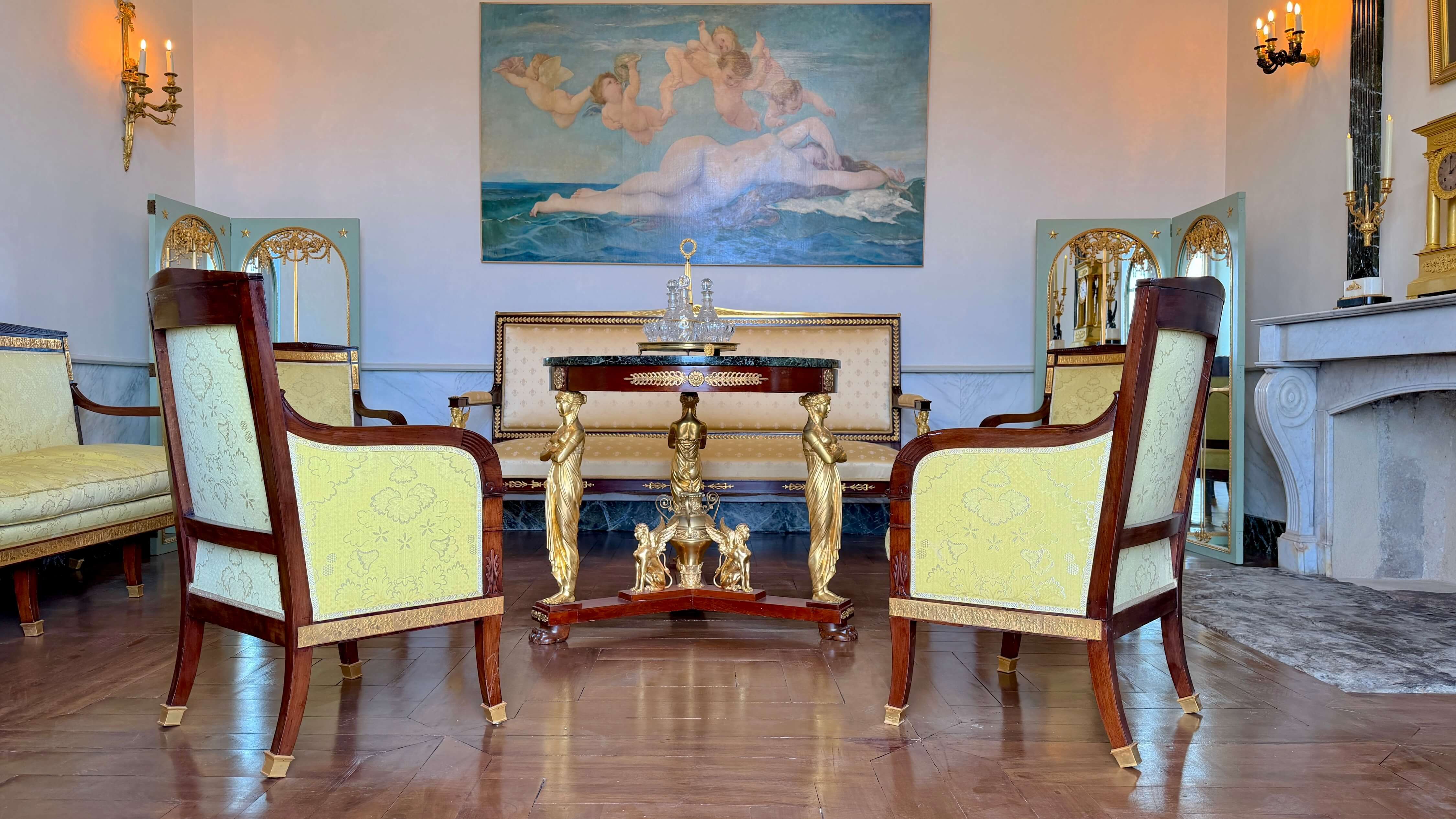 - Le marbre (cheminée) et la soie (tissus des sièges) complètent l’ensemble.