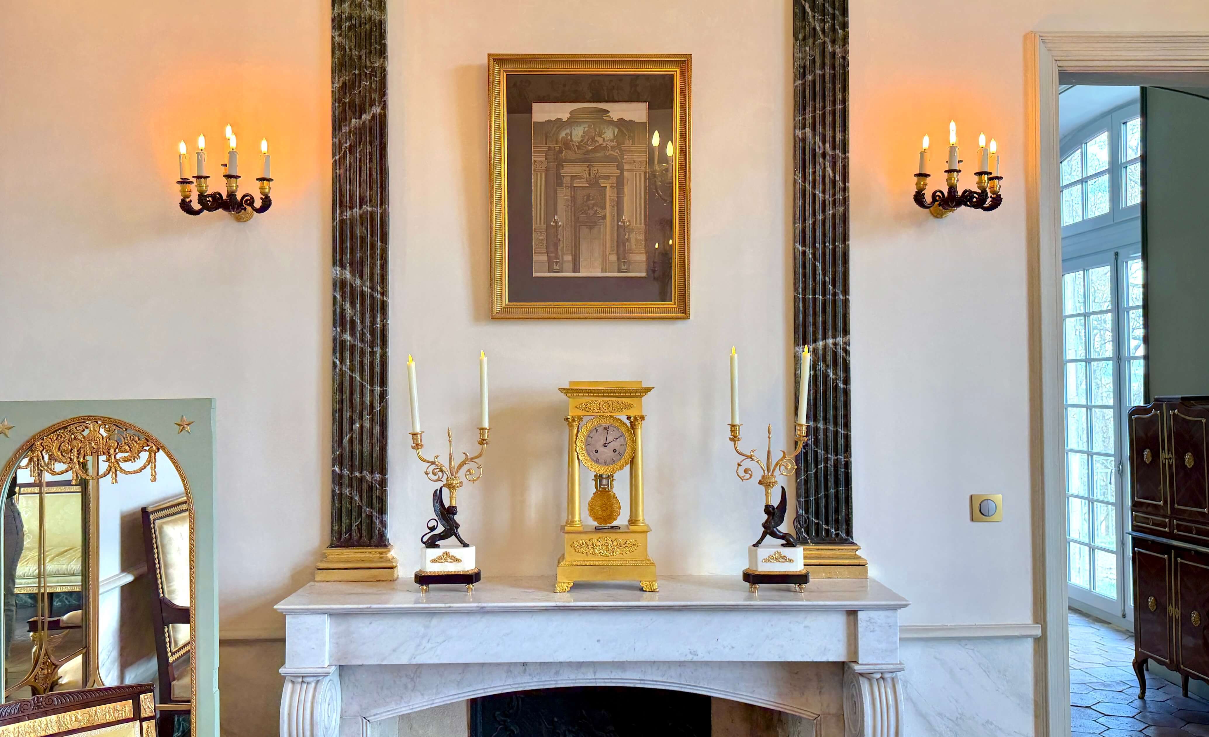 Une pièce 100 % Empire peut sembler figée. Ajoutez une touche Restauration ou Louis-Philippe pour plus de naturel.