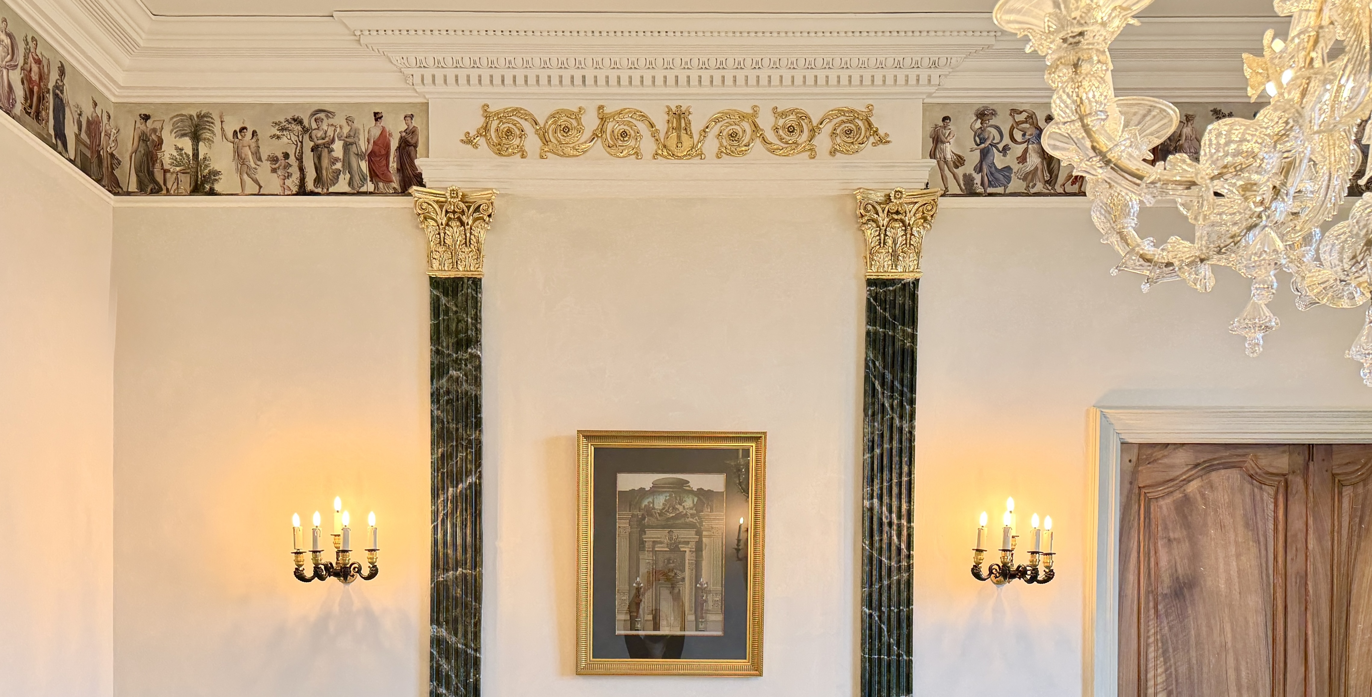 Afin d’accentuer le style néoclassique déjà existant de la pièce, nous avons fait le choix d’ajouter une frise à l’antique, provenant du salon de l'hôtel de la rue Chantereine, rebaptisée Hôtel de la Victoire en l'honneur du Général, occupé par Joséphine lors de son mariage avec Napoléon en 1796.