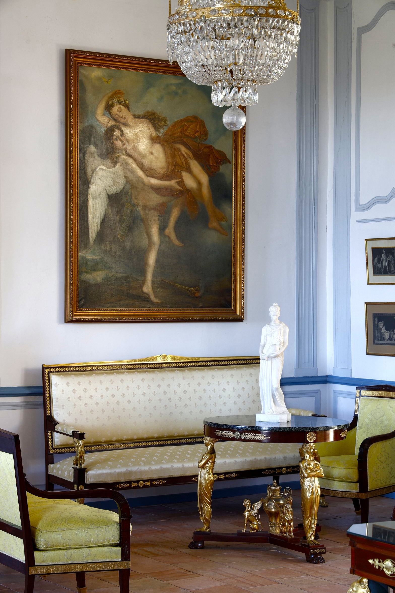 Dans ce petit coin salon on retrouve un ensemble d'assises, un canapé typiquement de style Empire, ainsi que des bergères et fauteuils en acajou. Au centre, on retrouve un important guéridon décoré d'une sculpture de la Samaritaine en albâtre. Le salon est décoré d'une très grande toile de Psyché et l'Amour