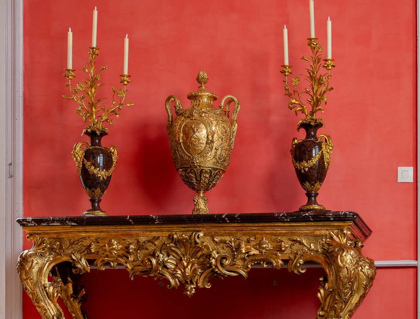 Sur une très imposante console en bois doré de style typiquement baroque italien du XVIIIème siècle, reposent un très grand vase ovoïde en bronze doré et une paire de candélabres de style Louis XVI en marbre rouge griotte et bronze doré