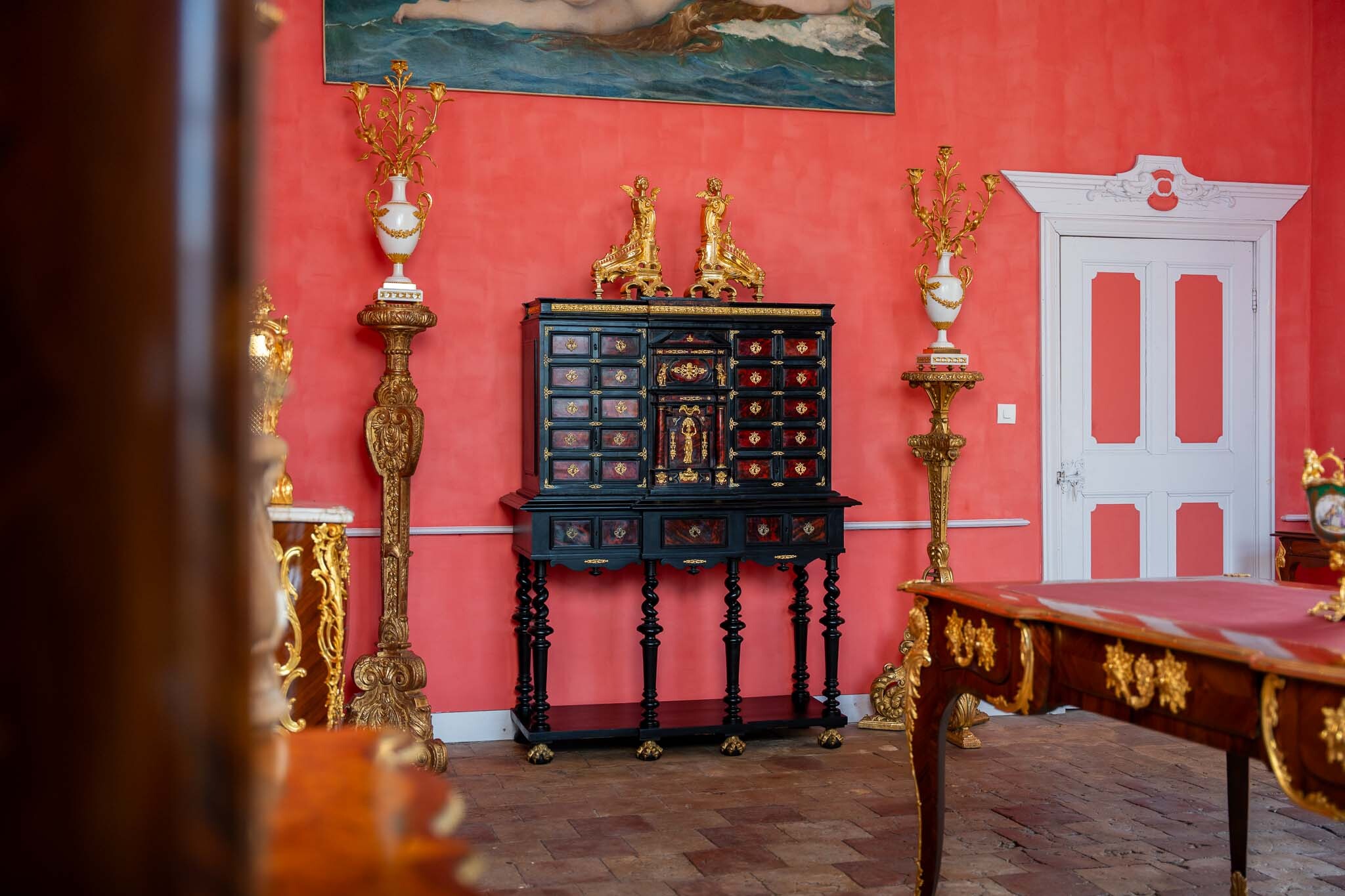 Au centre de cette pièce au style bien Rococo, trône un magnifique cabinet sur pied dans le style des cabinets Flamands. Ses couleurs sombres viennent parfaitement se contraster dans ce décor flamboyant et marie à merveille avec ces deux colonnes en bois doré, l'une de style Louis XIV et l'autre Régence. En décoration, nous retrouvons d'imposants candélabres balustres ainsi qu'une paire de chenets en bronze doré faisant office de décoration posés sur le cabinet.